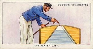 "The Coastguards and Customs Officers soon learned that the coasters, as well as the overseas traders, were Smuggling, and a false bulkhead shortened a hold by three or four feet was bound to be discovered. More subtle hiding-places were therefore needed, and a favourite device was the ship's water-cask, "doctored" as shown. It was proof against any ordinary examination, for the Customs probe would still be in water when it twisted as far round as the size of the bung-hole would allow." Ogden's Cigarettes Cards; "Smugglers and Smuggling" No.28