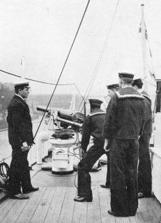 The gun had been left with a shell in the breach. I finished loading, brought it to the ready, took gun layer and directed the SPO who took trainer, and we put a shell through the front door of the Coastguard station – a good shot. What effect it had apart fro stopping whoever was shooting at us, we never heard. Our only casualty was the Chief who got a splinter off one of the guard rails in his trouser leg as he dived for the engine-room ladder from the ward-room. This drew blood but only just. We reported this ‘battle’ to Queenstown and were told not to try to deliver the senator’s mail.