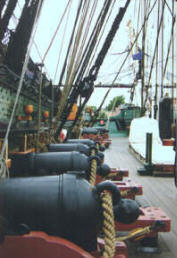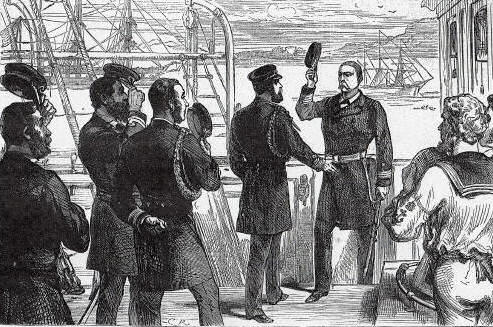 The Duke of Edinburgh [back to us] greeting Captain Potter of the 'Constellation'  There were many famines in Ireland in the nineteenth century. The most significant one was in 1845/6. The lessons learnt during this famine were put to use in later years. The most spectacular and best documented involvement of the Coastguards in relief operations along the western sea-board came in 1879/80. By then the Coastguard was under the control of the Admiralty and effectively an integral part of the Royal Navy which greatly facilitated co-operation between the Royal Navy cruisers offshore, the small boats operating close inshore and the shore stations. All the elements of the Coastguard were involved in distributing relief on behalf of the Dublin Mansion House Fund, the Duchess of Marlborough Fund and the generous donations of food and clothing from America. The operation culminated in the distribution of the relief brought by the U.S. Frigate 'Constellation' to Cork Harbour in April 1880 which was supervised and co-ordinated by the Duke of Edinburgh who was then in command of the Naval ships on the West coast. Rear Admiral The Duke of Edinburgh was a son of Queen Victoria, and in Mid-April and with his ships repaired to Cork to meet the U.S. frigate bearing badly needed supplies. On 20th.February 1880, the House of Representatives in Washington authorised the dispatch of a vessel with food and other supplies collected in the U.S. to relieve the distress in Ireland. The frigate 'Constellation' was made ready with the guns and other non-essential fixtures removed to allow the maximum cargo. She left New York on March 30th. with over 500 tons of provisions and clothing which had been donated mostly by residents of New York as part of the fund organised by the New York Herald newspaper:- 1,346 barrels of potatoes, 675 barrels of flour, 1,144 barrels of corn meal. 150 barrels of oatmeal, 59 cases of canned meats and 7 packages of clothing and shoes.