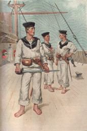 There were great doings on board this man-of-war on yesterday. Between decks was gaily decorated with holly and ivy, and the tars, with their wives and friends, who were present, were plentifully supplied with the best of Christmas fare. The various messes groaned beneath the weight of roast beef and mutton, with their necessary appendages, and plum puddings. To a stranger a coup d’oeil at the whole scene must have been wonderful. Jack was in his happiest mood, and the merry repartee passed from stem to stern in right good fellowship. After the debris of the dinner were cleared away and the usual loyal toasts drunk, the fun commenced. In the exuberance of their joy they carried Lieutenant Wilkinson round the ship, wishing “a merry Christmas and a happy new year” to their favourite, and afterwards chaired some of the petty officers. In almost every available corner there was a fiddler, and the honest and noble-hearted fellows footed it to their hearts delight, with some fair partner from shore, and many a sly salute was taken under the ivy, in the absence of the mistletoe. Everything went off with satisfaction, and it is our pleasing duty to state there was not a single instance of drunkenness to mar the festivities. An “open gangway” was the order of the day; the seamen could go on shore without asking leave. On board some men-of-war that are fully manned the whole discipline of the ship is entirely turned upside down on Christmas Day. It is not an uncommon thing to see a veteran boatswain lowered to a second class boy for the day, and one of these youngsters strutting about ship giving the word to scrub deck or coppers, or caning a captain of the fore-top, or other petty officer, if he did not sweep the deck properly. A happy new year to the stalwart sons of the ocean. (1)