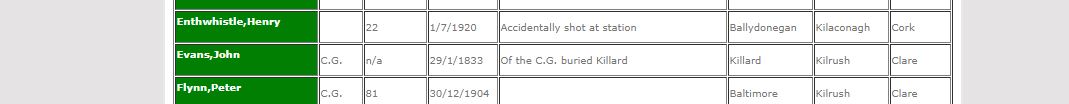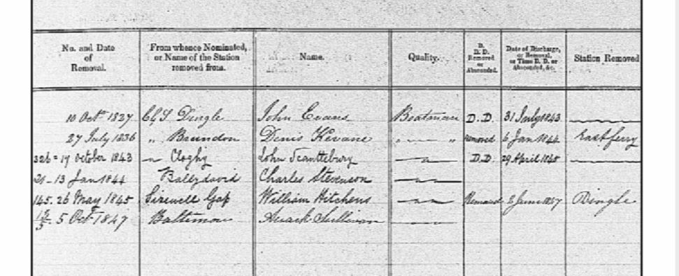 hi im hoping for anymore input if possible, i have recieved a bit of info from a kind member on this group, but am still none the wiser about some questions that are stopping me in my family research. i still need to know if john was born in Ireland? or did they move from his wifes/his home in beumaris/anglesey. i post below what i know, and what i was informed about, if anyone can shed more light, that would be great, i do know that his wife is a widow and living in carnarvon in 1851, so he must have died before then,,,# john evans coast guard? hi all. im hoping for sone help please. whike tracing my famiky tree back i have found that my great x4 grandfather was born in ireland john evans 1833 but have yet to lear anything about his parents john and sarah sarah was born in anglesey wales and all i have is from 1851 they are in caernarfon sarah evans as a widow. along with harriett evans and grace evans and john evans. jojn evans 1833 states he is born in tralee. i have spoken to an a genologist in ireland. and this is his reply to me. I have found a baptism on Irish Genealogy of a Harriott (sic) Elizabeth Evans, Ventry Parish in 1827 (daughter of John Evans & Sarah Evans). John's occupation is given as Coastguard, which makes a bit more sense. In order to progress, you should go to the National Archives Kew website, and search for references to John's Coastguard service record. I had a look, and found a John Evans with a station address at Dingle (just a few miles from Ventry). Unfortunately, I can't find any other reference to his children born in that area. can anyone else help me in any way with thus please? thanks for listening neil neil16377 Sunday 7th May 2017, 07:32PM Ventry (Kerry) Message Board Replies I managed to locate Coastguard records for your John Evans as follows : Ref : pg 176 / ADM 175-16 Station : Ballydavid date removed : from station : J.B. (? F.B.) same notation for 6 others at Ballydavid Name/Rank : John Evans / Boatman Reason :removed Date Discharge/Removal : 31 May 1826 to Station : Dingle Ref : pg 179 / AD 175-16 Station : Dingle date removed : 31 May 1826 from station : CGS Ballydavid Name/Rank : John Evans / Boatman Reason : removed Date Discharge/Removal : 10 Oct 1827 to Station : Ventry pg 170 / AD 175-16 Station : Ventry date removed : 10 Oct 1827 from station : Dingle Name/Rank : John Evans / Boatman Reason : - Date Discharge/Removal : - to Station : - Notes : - pg 165 / ADM Station : Ventry date removed : 10 Oct 1827 from station : Dingle Name/Rank : John Evans / Boatman Reason : Died Date Discharge/Removal : 31 July 1843[?] to Station : I'm not sure what the notation under 'from' on the initial Ballydavid record stands for - I'd suggest a posting on the Coastguards of Yesteryear website to ask the experts there, include the references above. The Church of Ireland marriage records for Ventry parish only go back to 1845 - early records for the parish were apparently lost during the civil war. The baptism for Harriott Elizabeth Evans seems to be listed under Dingle rather than Ventry parish. (this entry is about half way down on the right hand page) There are a number of other baptisms on the same page which mention coastguards. Merged on 13/05/2017 18:17:08: i have just seen that he died in 1843, Merged on 14/05/2017 13:36:46: can anyone please tell me if there is possibly a way of knowing his cause of death in 1843 please and where he might be buried Merged on 01/08/2017 15:23:17: There is got to be something else i can search guys e contacted ventry /ireland archives, ive spoken with Kew archives, abd im still none the wiser, if traced his famiky backwards, but i feel a strong Need to know Where and How this Man Died. surely thete is sonething somewhere guys???? Merged on 01/12/2017 19:04:32: back again,,,still none the wiser of where this man could have been buried!! i found a john evans on the burial page on this site......could this be him, with dated wrong on either side? Merged on 07/04/2019 20:50:05: Any more tips on finding how and where he may have died please??