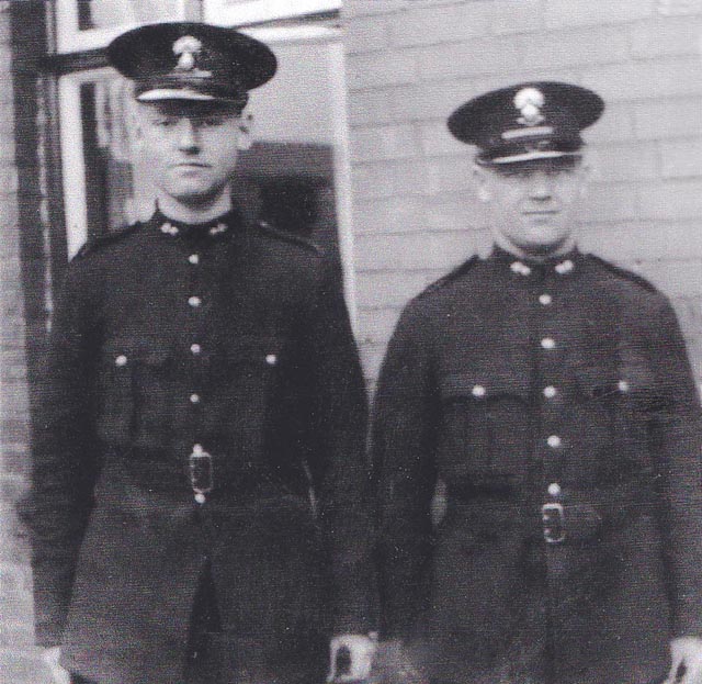 I need help identifying the uniforms of these fellows. The fellow on the right is reported to be Thomas Davis Fox b. 1858, who served in the Coast Guard in the north of Ireland until pensioned in 1910: 1887–1889 Dunany Point Co Louth, Ireland 1889 -1896 Clogherhead, Co Louth, Ireland 1896 - 1901 Ballintoy, [Co Antrim, Ireland] 1903 North of Ireland Chief Boatman, Kilkeel, North Arran, Tirbane, Sheephaven. But much as it resembles dress uniforms of the army in WWI, I have seen no such uniforms associated with the coast guards as yet. The cap badges appear similar to various grenadier and fusilier badges I have found, including (the most similar) a WWI cap badge worn by the Tyneside Irish Brigade of the Northumberland Fusiliers. If the family ID is correct, this would have to be a dress blue navy/coastguard uniform dating well before WWI and indeed before 1911. Is this possible? Rating? Please help.